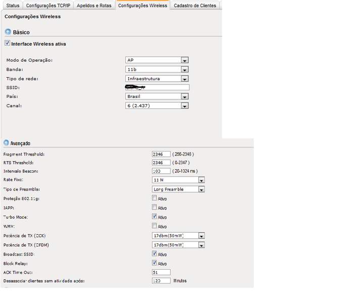 Aqui uso nessas configurações da imagem acima e não tenho problemas e dessa forma eu conseguia atender um cliente a 2km de distancia.