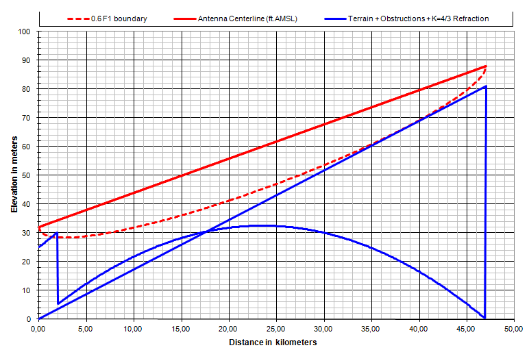 Vamos lá, se uma antena esta a 30 mts e a outra a ~100 a zona de fresnel "raspa" no mar tem uma margem de somente 9 metros se contar ~1.2mts de mare temos 8 mts somente.