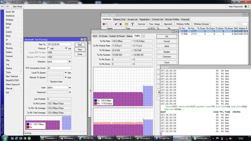 Alguns fatores como zona de freznel e até a métrica do cabo de descida afetam o link. Quem sabia por exemplo que o cabo de descida ou pigtail precisa ter medida múltipla de 50(pode variar de acordo com a frequencia - comprimento de onda)? Ou seja, é melhor usar um cabo de 50cm do que um de 15, 30 ou 45cm? A altura dos equipamentos na torre ou a distancia dos demais equipamentos fazem muita diferença quanto à eficiência do espectro, se o espectro já começa a ser irradiado com deformação, o resultado pode não será bom, e assim vai. Tenho visto que o pessoal acostumou a montar enlaces de qualquer jeito e funciona muito bem para curtas distancias, aqui mesmo na cidade vejo nanostations instalada em clientes até em pé de mamão, debaixo de telha de zinco, atrás de gaiola de passarinho etc... Quando pretende-se montar um link de longa distancia com alta performance, os mínimos detalhes evidenciam-se no link. Digo isso porque eu tomei coro demais em um link de longa distancia que tenho(80km). Enquanto eu não dei valor para os mínimos detalhes eu não tive sucesso. Hoje ele está com XR5 + rb433AH +oiw33 com 25megas full e 45 megas half. Tem mais, instalar mais de um cartão na mesma Rb para fechar links de longa distancia, não funciona. A fonte de irradiação fica a milímetros de distancia uma da outra... o que funciona para links de curta distancia não funciona para longa...