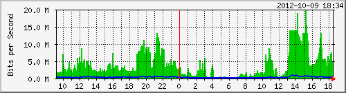 No relatório do MRTG, aparece picos de consumo de banda de 20 megas, que é o que eu tenho de link aqui.
