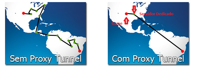 " Basicamente Proxy Tunneling é um serviço que diminui o lag (quase que totalmente) nos jogos online. O truque consiste em criar um "túnel" que utiliza uma rota otimizada, ligando seu PC a um servidor proxy de conexão direta com os servers do jogo, pulando várias etapas na rota entre o seu computador e o host do game. Isso reduz consideravelmente a latência (ping), proporcionando uma conexão muito mais estável. "