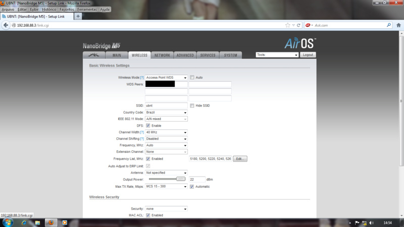 Boa noite meus amigos sou novo na area e sei que este forum só tem feras, já tem dois meses que estou penando para para colocar meu link de 10km para funcionar e não estou conseguindo eu uso um par de nanobrigde m5 25 dbi as configurações estao em anexo. Desde já muito obrigado: