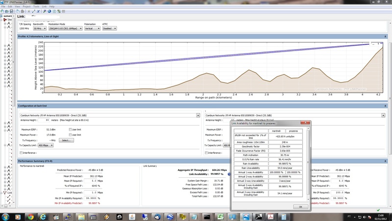 O sinal fica na média em -58db, o que é muito bom para um enlace Ubiquiti mas um pouco fraco comparado com um enlace licenciado. No fórum da UBNT vi relato de -60 para enlace da mesma distância, não sei em qual tx power. Pelo Linkplanner da Cambium ou Pathloss 5 estima-se rx de -45 (ver anexo), comparando-se com um rádio de 17db tx (23db menos potente do que configurado na interface do airfiber e 16db a menos do que o datasheet informa) e antena de 30cm de 35.5db de ganho em conexão direta (similar a média das antenas do airfiber). O sinal esperado para o airfiber com um tx power de 33 db seria de -42, não -58. A Ubiquiti nunca foi muito transparente nas especificações reais dos seus equipamentos.