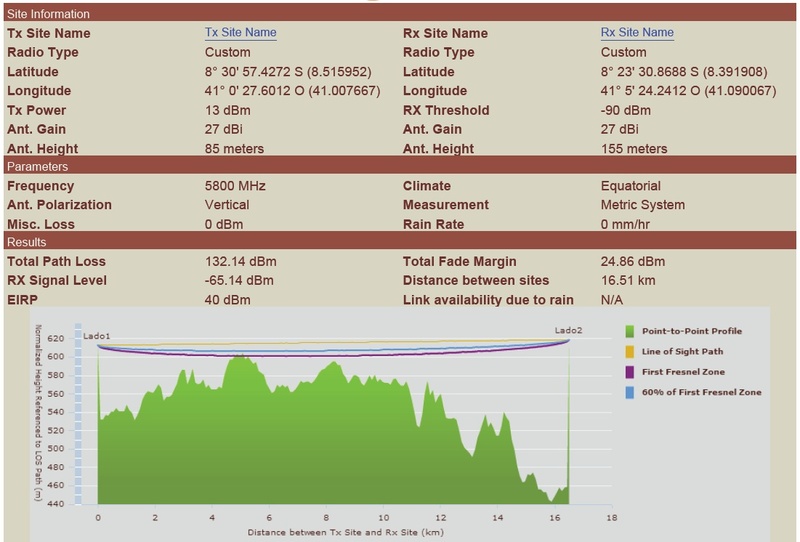 Chutei no 2º ponto uma torre de 155m e no 1º ponto uma de 'apenas' 85m. Ai até fecha nos 60% de fresnel.