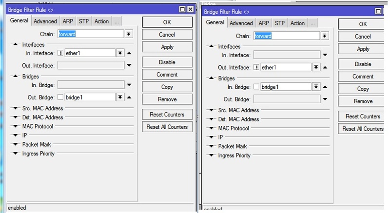 interface bridge filter chain=forward out-interface=!ether1 action=drop in-interface=!ether1