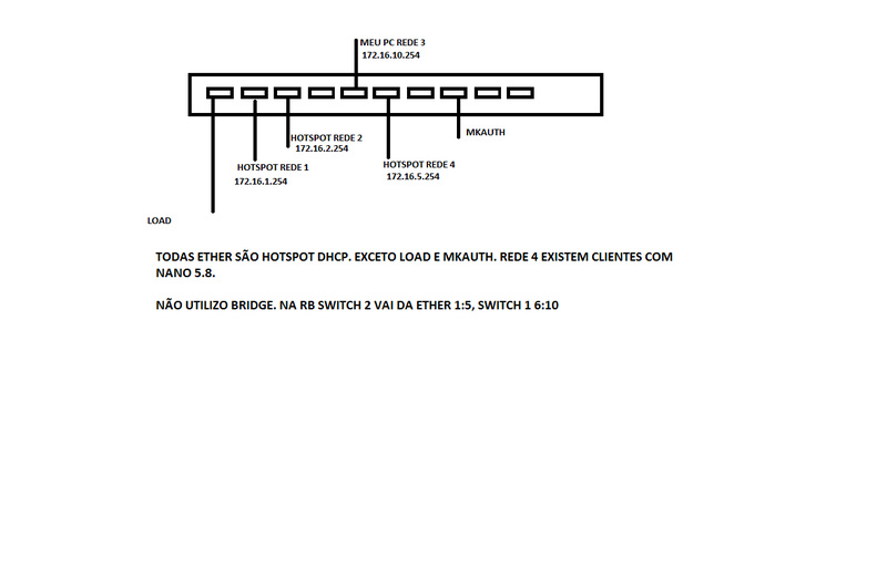 Bom seguinte tenho uma rb 1100ah configurada para cada ether receber seu ip utilizo load na ether 1 e da 2 ate a 6 setei faixas de ips diferentes 172.16.1.xxx-172.16.2.xxx e por ai vai. O que quero fazer é o seguinte, quero que minha ether5 ip 172.16.10.xxx acesse pelo discovery tools as nanos que estão na ether 6 que pertencem ao swith2 na rb,as nanos recebem dhcp com ip 172.16.5.xxx