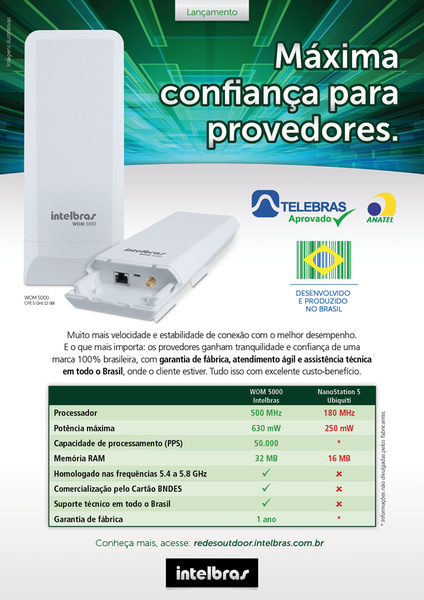 Produzido no Brasil, este dispositivo trabalha na faixa de frequência de 5,1 a 5,8 GHz com velocidade de até 150 Mbps, além de possuir antena integrada com ganho de 12 dBi com polarização horizontal ou vertical selecionável via software e potência de 630 mW.