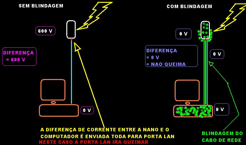 usando o cabo blindado a corrente que iria para a porta lan nao vai mais diretamente para ela e sim para todos os dispositivos