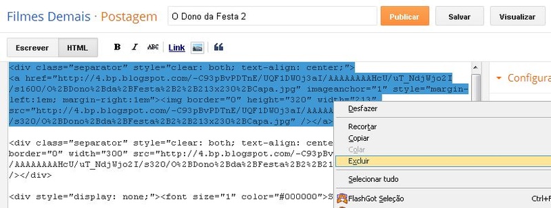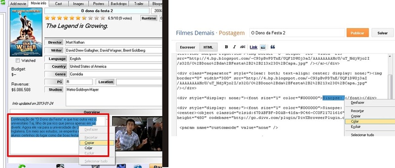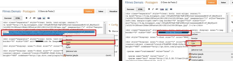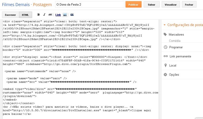 • Agora vamos a parte principal da postagem, adicionar o código para os filmes funcionarem, e a sinopse e a imagem ficar oculta