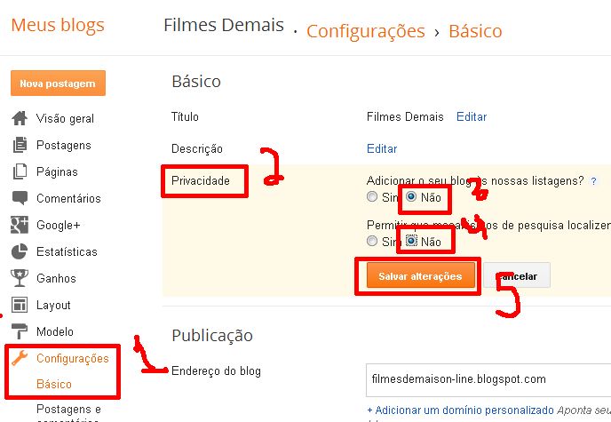 • Vamos fazer uma coisa muito importante, o blog é Público vamos fazer com que ele não apareça nos mecanismos de busca, veja na figura: