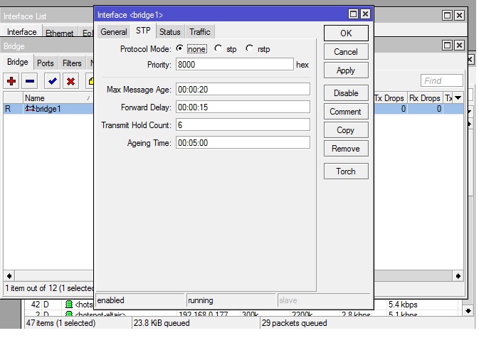 Amigo criar uma brigde na sua RB e faça igual na imagem abaixo, prefiro habiltar o RSTP (Rapid Spanning Tree Protocol), isso podera deixar sua rede mais lenta um pouco, mais nada que venha se preocupar. Acho que não resolvera seu problema, procure perceber em qual ether esta com alto trafego; pode esta acontecendo um loop na ponta da sua rede. Sucesso amigo..
