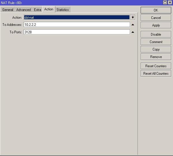 Faço o redirecionamento via NAT da porta 80 para 3128, e meu proxy esta ligado diretamente ao Mikrotik por uma ether fisica, nao passa por Switch: