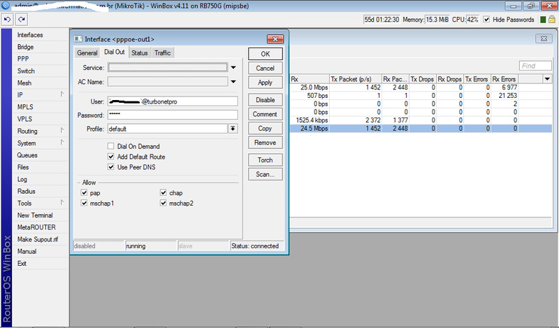 agora entrei no modem, mudei para o modo bridge, fui la na rb, na interface do meu link. criei um pppoe cliente. com os dados de minha operadora, turbonet@turbonet senha gvt25. porém nao está funcionando. o que estou fazendo de errado???