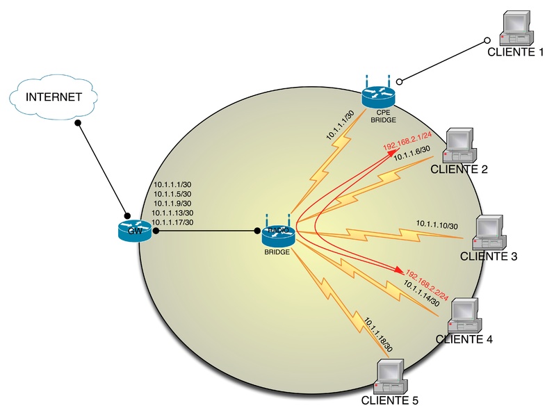 A figura demonstra o cenário comum de redes de provedores, as configurações de topologia podem variar bastante, neste caso foi usado a mascara 255.255.255.252 ou 30 bits.