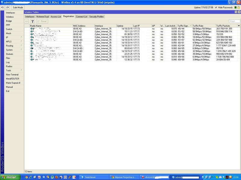 Obs.: Alguns clientes estão modulado no tx/rx rate com 3.0Mbps/3.0Mbps, porem não é problema se sinal e sim que o cliente não esta usando, quando o cliente esta sem uso algum ele baixa o data rate do cliente e fixa no mínimo de 3mbps quando o cliente inicia o uso ele automaticamente modula mais alto, como nas imagens.