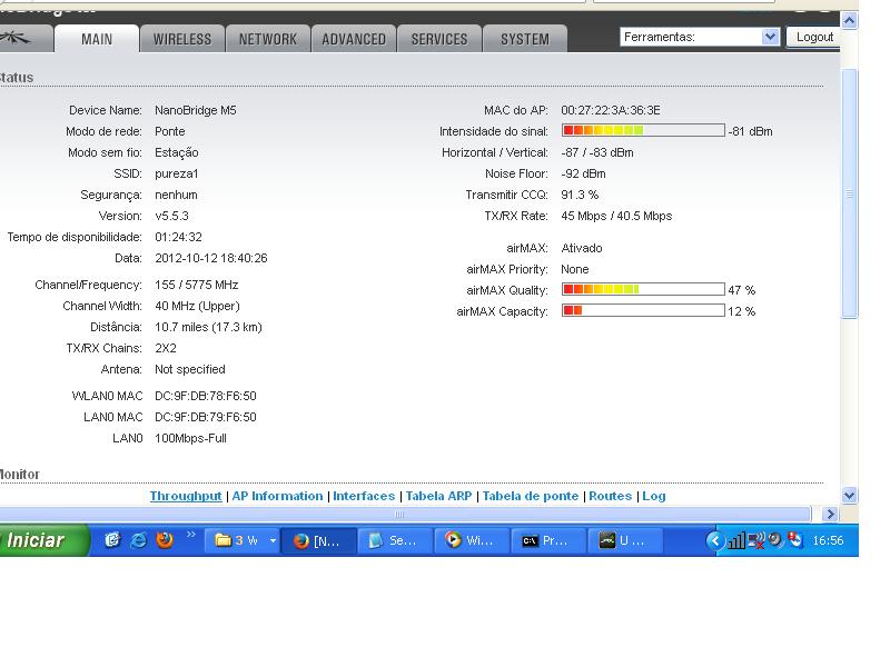 Boa tarde, venho registrar minha experiencia nesse enlace, primeiramente venho dizer que fechei o enlace, entre a cidade e a Fazenda, utilizei duas nanobridge m5 de 22dbi, uma a 30mt na cidade e outra á 30mt na fazenda, realizei o teste de ping ficou variando entre 3 e 5ms, tinha montado a nano na torre da cidade a uns 30 dias atrás, nesse intervalo ouve muitas chuvas e raios e queimou a porta lan, na nanobridge liga normal só que nao dá lan, vou postar umas imagem do ptp.