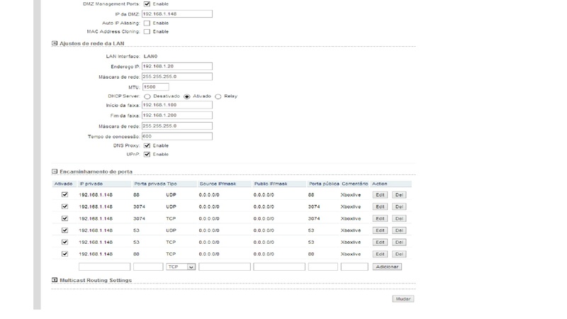 Pessoal não estou conseguindo abrir as portas para liberar a NAT no Xbox 360, o que eu coloco no source ip e ip publico, lembrando que eu coloquei o IP DO XBOX(192.168.1.149) ONDE ESTÁ IP PRIVADO. O IP DO MODEM É 192.168.1.20 como eu faço? Desde já agradeço e espero que alguem possa me ajudar!