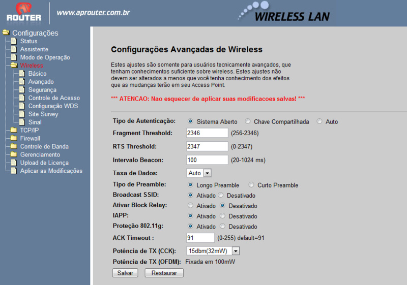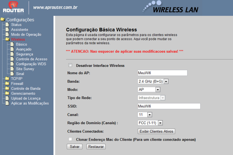 Modo AP Banda 2.4 GHz (B+G) SSID Meu Wifi Canal 11 Criptografia WPA