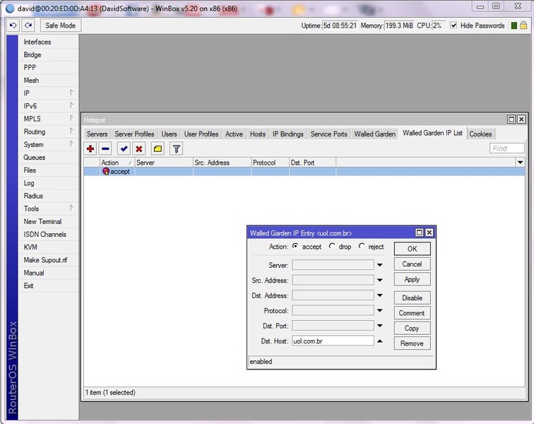 Anexo 46388ola pessoas, to tentando colocar o site do uol, para ser acessado mesmo sem logim, ja fui na aba -walled garden IP list- fiz tudo com tinha visto aqui no site, mas nao deu certo, o que sera que ta faltando, ou sera que nao e ali que faz os sites passarem por tras do hotspot, o que eu fiz de errado me ajudem, minha RB e uma V5.20. aguardo respostas