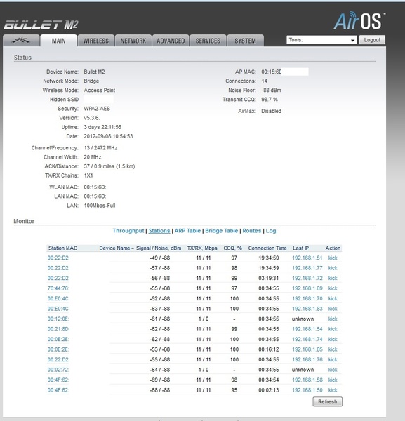 Esse AP está segurando alguns poucos clientes antigos que ainda usam radinhos antigos, Realtek 8186 e algumas CPE's mais novas com 8196C. Esse AP tem 18 clientes, com média de 15 online, mas olhando o tempo de conexão na imagem que postarei pra vocês, se vê que apesar do AP estar com 3 dias sem reboot, tem varios clientes na faixa dos 34 minutos conectados, mas na pratica muitos nem desligam a antena e no lado deles tao com por exemplo, 60 dias ligado... é como omo se todos tivessem sido desconectados no mesmo tempo e reconectado. Eu cheguei a pensar em incompatibilidade dos Realtek com o Bullet M2, mas tem cliente ai com 8196C q não desassocia (apesar do tempo na imagem esta abaixo do AP, pq eu reinicei o radio do cliente remotamente...), mas tb tem outros com mesma CPE com esse chipset q ta na "leva" dos que ficam desassociando, entao não sei o que acontece.