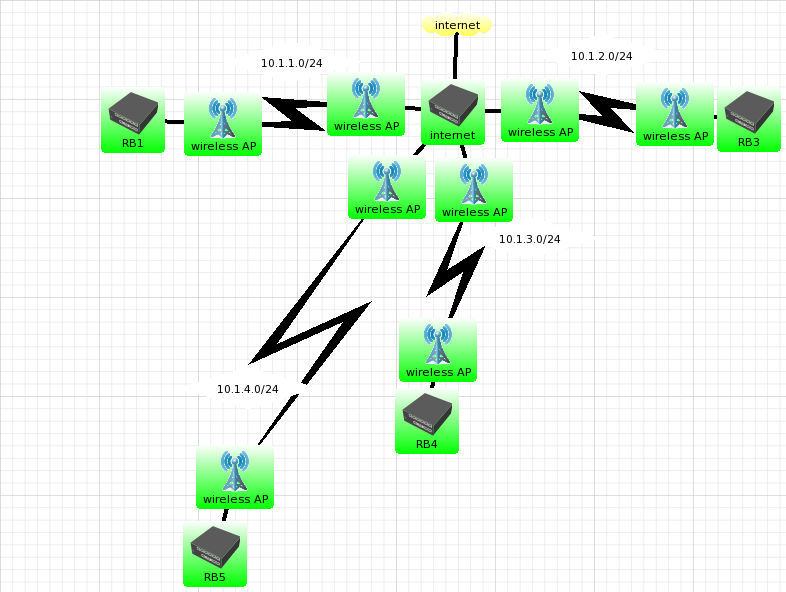 vc vai ter que colocar mais radios ligando os outros RBs um apontando para o outro.( eu estou supondo que é tudo enlace wireless)