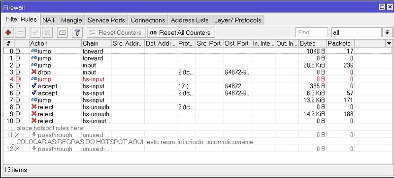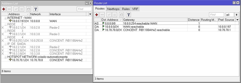 Veja só os endereços e as rotas e do outro lado as regras NAT E Filter rules criadas pelo Hotspot
