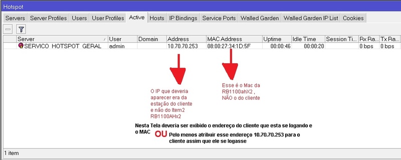 Os clientes se logam no hotspot (Item_1) normalmente , mas não consigo ter controle sobre eles , pois em active o endereço mac que aparece lá , bem como o endreço IP , são endereços da minha RB1100AHx2 do Item 2 , Ou seja o Ip não esta passando para o cliente , e acredito que por conta disso o cliente consegue se logar , mas eu não consigo fazer um leases nele ou forçar com que ele se autentique apenas com o determinado MAC x IP