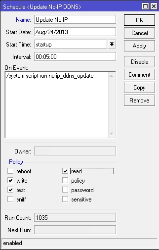 /system scheduler add comment="Update No-IP" disabled=no interval=5m \ name=no-ip_ddns_update on-event=no-ip_ddns_update policy=read,write,test