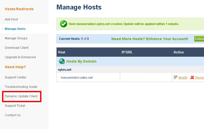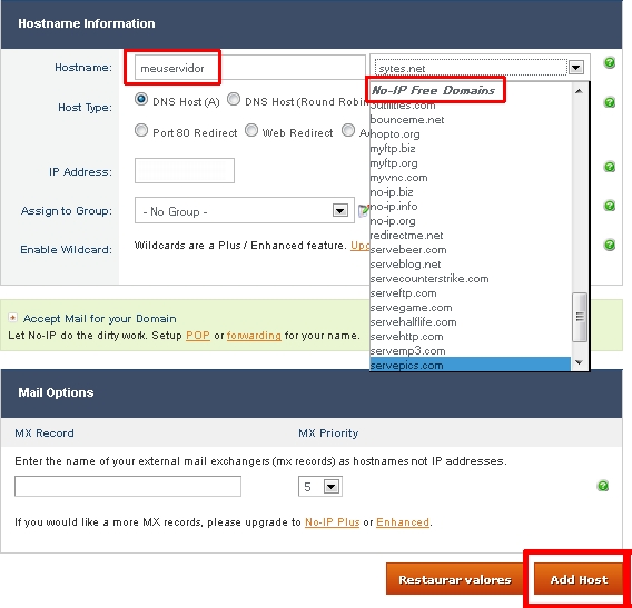 • Crie um hostname para o tutorial eu botei meuservidorr.sytes.net que o sytes.net é gratuito, após escolhido clique em "Add Host"