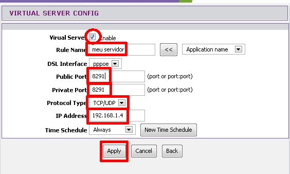 Pronto digite corretamente as configurações de seu IP e porta e aplique, logo depois é só reiniciar seu modem.