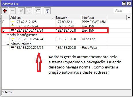 Olá Caros amigos estou com um problema chato. Tenho um pc com mikrotik. Resolvi comprar uma rb 450g para substituir o pc. Configurei ela com meus clientes e o hotspot. Minha rede está dividida em 3 portas de rede. Uma para o link, uma para a rede cabeada e a ultima para rede wireless. Só que quando inicio a rb, na rede cabeada ela cria um address indesejado na mesma faixa de ip que determinei para a rede cabeada isso me impede de navegar. Quando apago este address começo a navegar. O que faço para o sistema não criar este address?