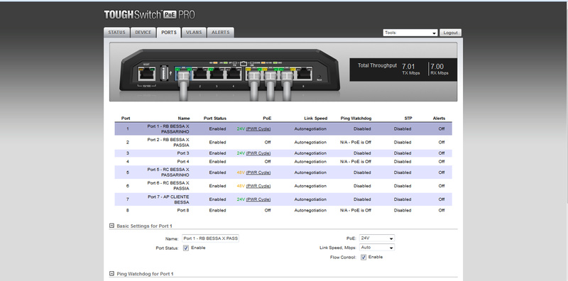 Tenho um backbone com 7 torres e com duas redes, mas somente uma está funcionando. Quando implantei a segunda rede, com RB912, adicionei uma ToughSwitch de 8 portas para fins de alimentar os equipamentos e para ter poder de reiniciar os equipamentos sem a necessidade de acessá-los. A ideia era boa até eu fechar o segundo enlace, pois detectei loop dando entres as redes e somente nesse ponto (enlace), para ver se poderia ser routeamento retornando, eu desativei a porta da segunda rede, mas mesmo assim o loop continuou. As VLAN's estão configuradas das seguinte maneira: porta de 1 a 4, vlan1, todas marcadas como untag - rede 1, e portas de 5 a 8, vlan2, todas marcadas como untag - rede 2. Com essas configurações, se eu tiver conectado através da rede 1, não enxergo e nem acesso os rádios da rede 2.