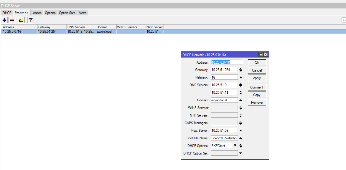 /ip dhcp-server network add address=192.168.0.0/24 boot-file-name=pxelinux.0 comment=dhcp-lan dhcp-option="" dns-server=192.168.0.5 gateway=192.168.0.1 netmask=25 next-server=192.168.0.2 ntp-server=192.168.0.5 wins-server=192.168.0.5 domain=ccbsumare.local