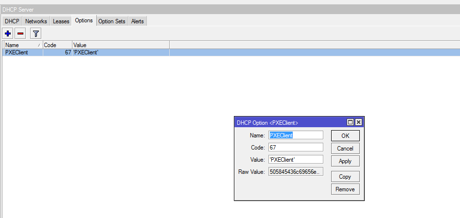 Pessoal eu tenho um RB750GL onde tenho um DHCP Server para os cliente até qui tudo bem, mas preciso configurar a opção de PXE para que algumas maquinas possa pegar o IP via PXE no boot.