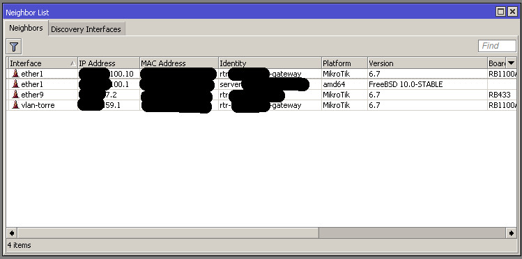 Anexo envio imagem de um servidor FreeBSD com o serviço CDP habilitado, ofertando dados para um ativo com MikroTik RouterOS, nativamente "escutando" os protocolos CDP/LLDP, demonstrando assim que é possível qualquer ativo de rede, passível de implementação, possa prover respostas à descoberta (discovery). Na imagem abaixo, um Routerboard 1100AHx2 está "descobrindo" um servidor FreeBSD.
