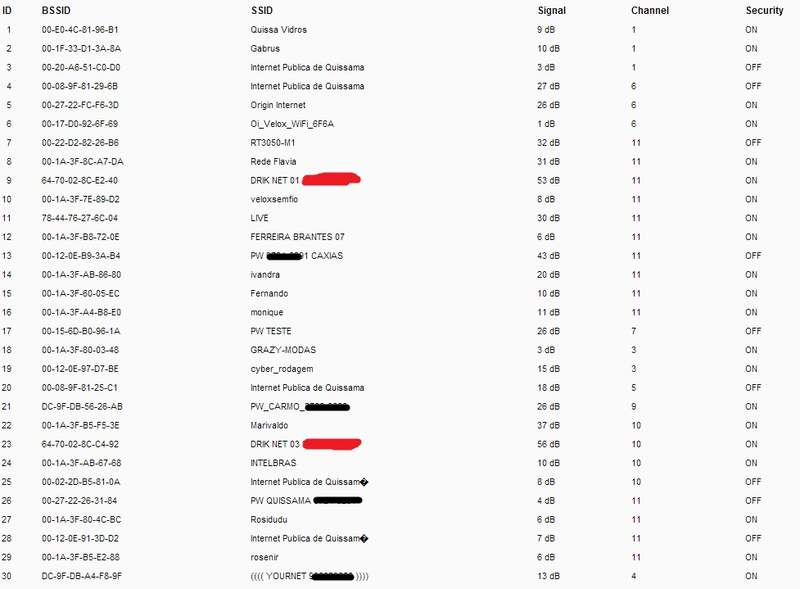 Segue embaixo a foto de um survey da minha cpe, 30 redes aparecem ao redor d minha central, tenho 3 tp link TL wa5210g fazendo direita _I_esquerda, e pra frente, eu faço teste aqui e nao consigo passar mais de 3mb na rede gerencio toda rede por uma rb 750 plano maximo 600kbps, ficam conectado no maximo 9 clientes anoite, a minha torre estar marcada de vermelho na foto..e qual o melhor canal a ser usado aqui, B ou G??.
