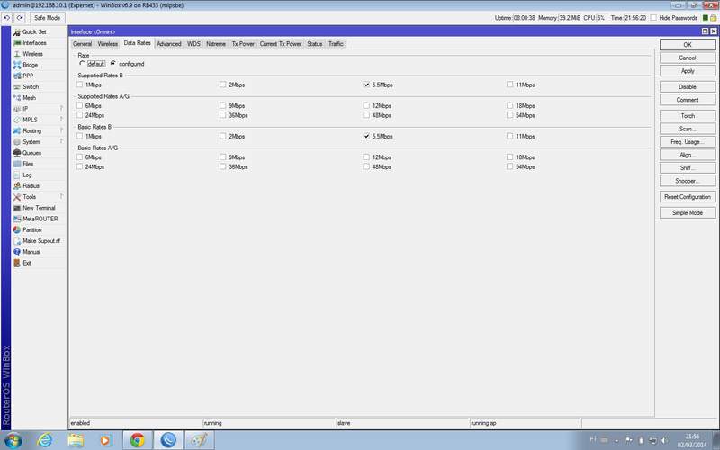Você setou em B/G o cartão.... certo....mas porque deixou só em 5mbps o data rates? deixa em default para começar os ajustes. Depois vendo como fica o desempenho geral você pode excluir os data rates mais baixos.