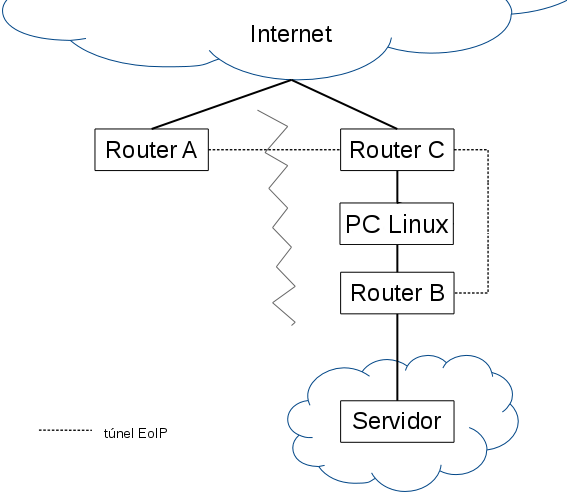 Os routers A e B estão ligados por túneis EoIP por meio de um bridge no router C: