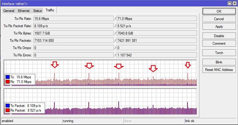 precisei trocar meu servidor mikrotik por outro com portas 100/1000, não subi backup, fiz tudo na mão desde o inicio e dei alguns export em algumas coisas, só que após esta troca fica aparecendo no gráfico uns picos de consumo ... achei que após isso minha rede passou a não consumir todo o link (banda sobrando apesar de mais clientes online), gostaria de uma forma de solucionar isto e agradeço quem puder ajudar ... Obs: ja aconteceu a anos atrás e eu resolvi não me lembro como :dontknow:. Abaixo um print do winbox e webfig