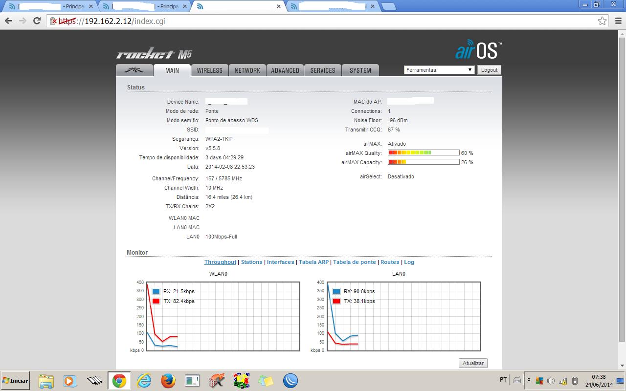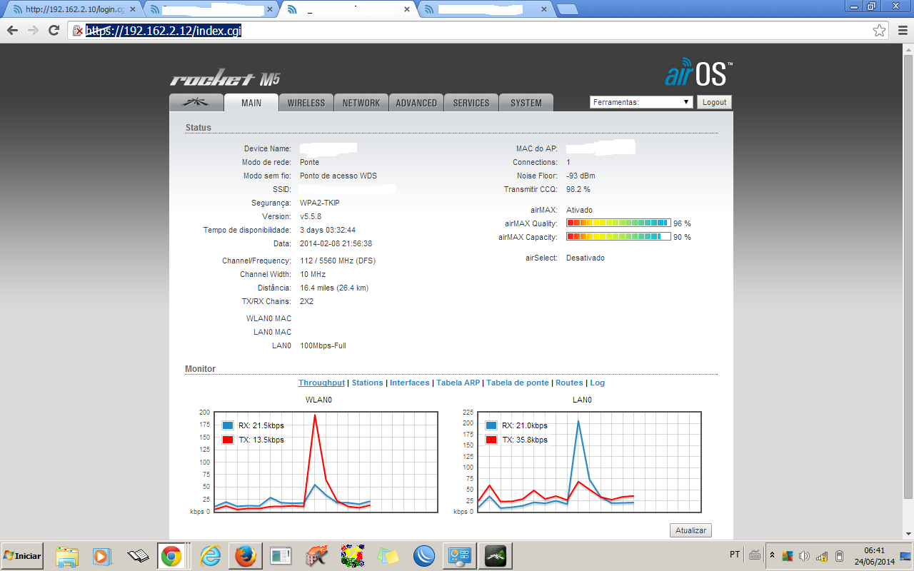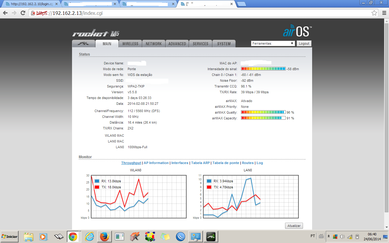 Antes que alguém fale das antenas, gostaria de deixar claro que até Rocket disco de 34 Dbi eu já usei aqui, e a problema é o mesmo, melhorou o sinal mais o ccq estava variando muito, ai resolvi tirar as antenas de 34 e colocar duas de 30,pois não tem necessidade de tais antenas de 34 dbi se um par de 30 resolve(TIREI ESSAS CONCLUSÕES AQUI NO FÓRUM)!