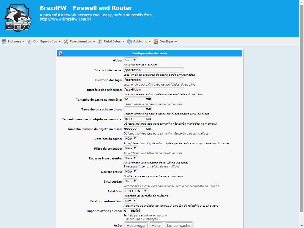 Arthur Bernardes , eu utilizei durante muito tempo o console para configurar o squid, mas devido a minha ausência física e a facilidade de configuração remota do bfw passei a utilizar o browser para configurar. Segue abaixo o print da configuração de cache