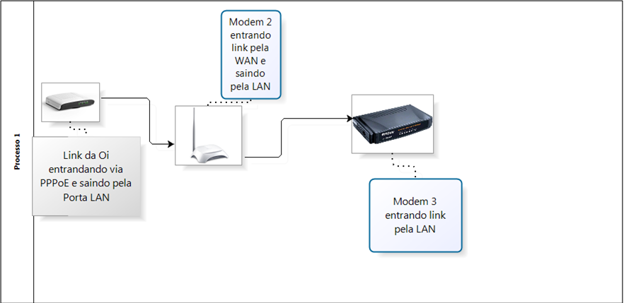 Assim o link vem e entra no 1 modem via PPPoE e sai pela porta LAN e ontra na porta LAN do 2 modem e depois na porta LAN do 3 modem