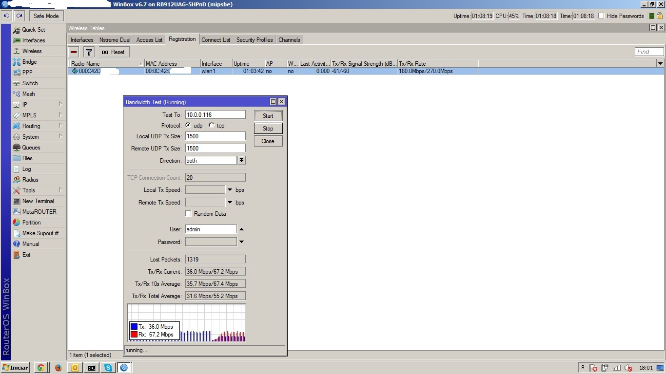 Caros amigos do forum boa tarde, estou com problemas em fazer com que meu link passe mais banda, instalei as antenas e alinhei tudo certo, está chegando -62 dbm de sinal, estou utilizando o modo 5G A/N em wds tudo certo, quando realizo testes de velocidade o o trafego que passa é muito baixo, oscila entre 1 e 2 mbps. A visada é limpa nesse enlace, mas preciso que passe pelo menos 10mb full e não estou conseguindo isso. Preciso de ajuda valeu!!!