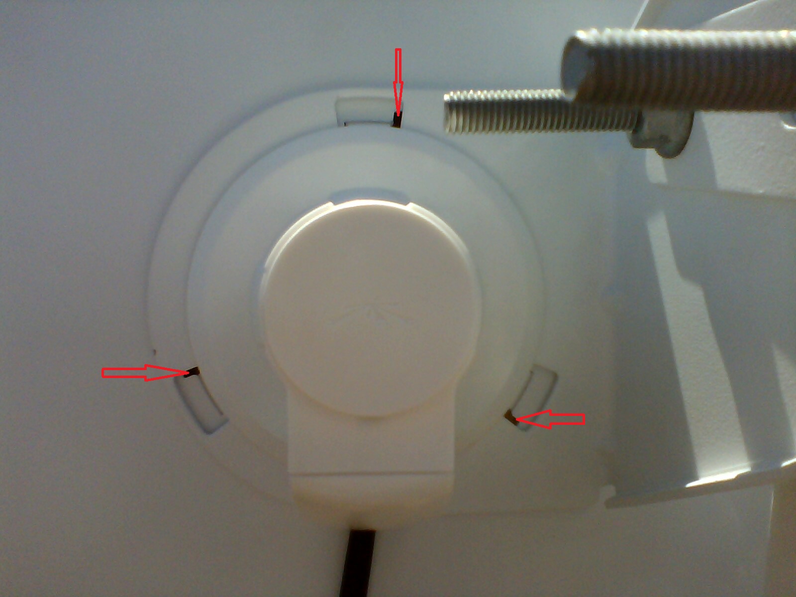 Venho aqui hoje postar um assunto que observei ao usar a nanobeam com radome shield. Todos sabem que a Ubiquiti efetuou algumas mudanças em relação as Nanobridge. Um deles é o encaixe do suporte ao disco... Bom vamos ao assunto, o que venho aqui monstrar é que se observarem pela foto postada, note que fica orifcios abertos, como mostra as setas nas fotos. Bom qual problema disso? Bom se nao usar um radome creio que nao afetara em nada... Mas se ao usarmos um radome, e chegar a epoca de chuvas, o que ira acontecer, entrará agua, e a mesma se acumulara dentro do radome, correto? E todos aqui sabem que isso nao é nada bom...