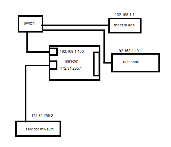 Bom dia Alexrock. Desde já agradecido pela ajuda. O gateway de internet é o modem. No meu entendimento, o Mikrotik, o MKauth e tudo que está atrás do modem fazem parte da rede interna. No caso do servidor MKauth ele está mais distante ainda, pois está em outra rede e em outra porta (ether2) do Mikrotik. Sendo assim, pergunto: faz diferença para o note que o gateway seja o modem?