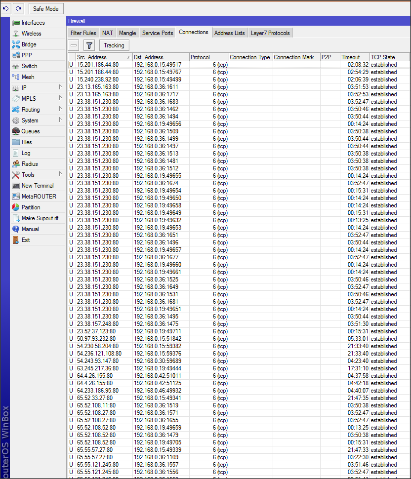 (Alias, mas testa isso em maquina normal, com atualizações inúteis rodando, com p2p mal-configurado (No default) com alguns adwares instalados, enfim, se rodar em maquina capada (Sem inutilidades desperdiçando banda) não verá conexão persistente e não verá uma maquina do mundo real, MK exibe esse monte de conexão persistente quando nele se conectam maquinas do mundo real)