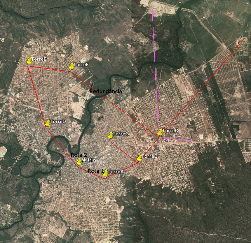 Essas torres eu utilizo para chegar nos bairros através de enlaces NanoBrige M5 e totalizam 7 torres e células que estão praticamente em estrela e apenas uma rota de saída/entrada.