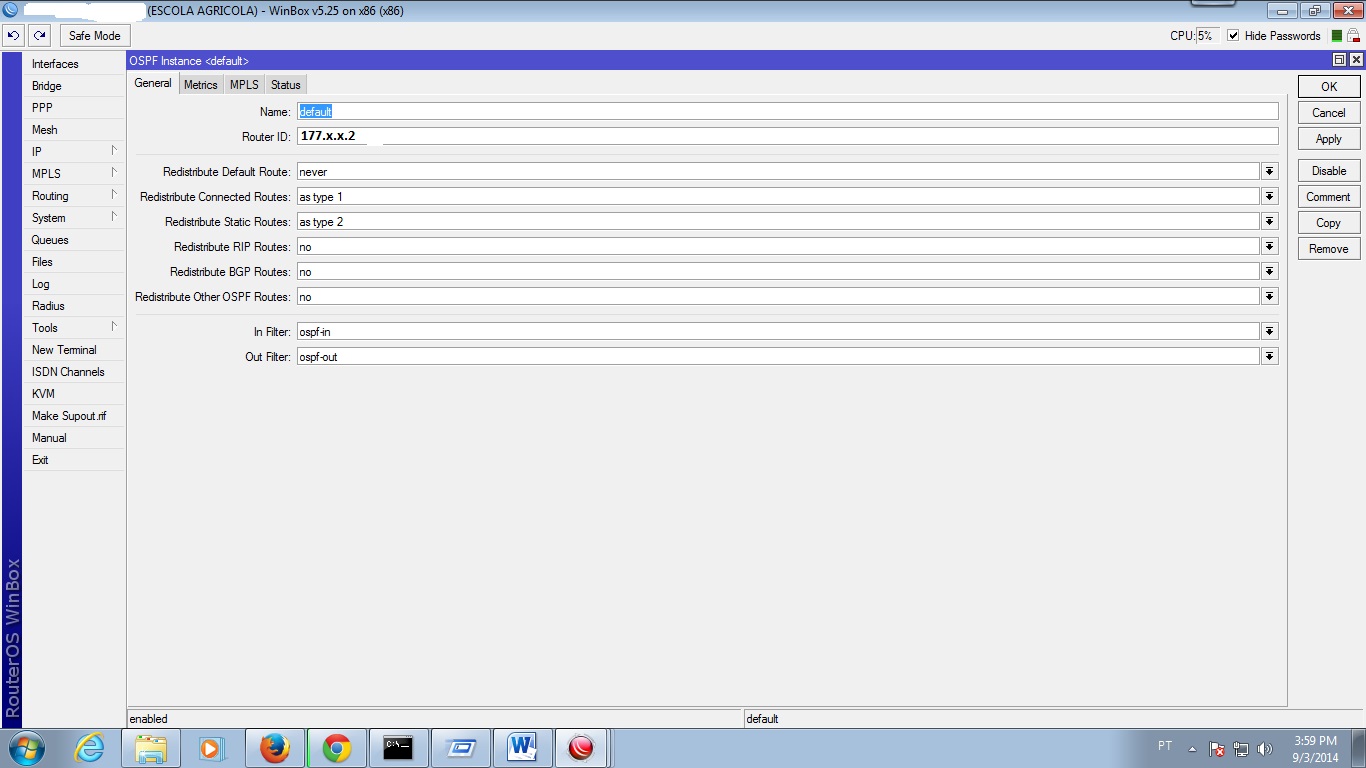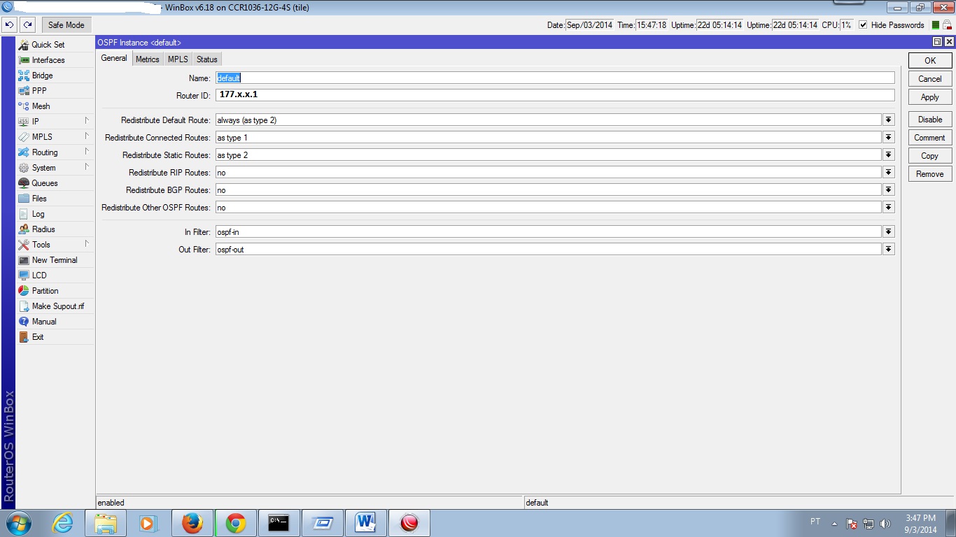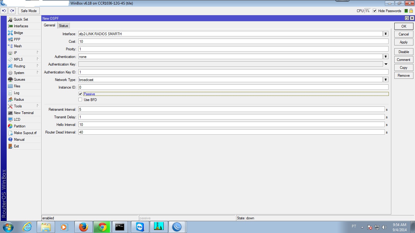 Vai aparecer várias entradas, cada uma faz referência a uma interface de seu router, como elas são criadas dinamicamente não é possível alterar, mas você pode clicar duas vezes e ir em "COPIAR" dai dai na janela que vai abrir, você marca um checkbox chamado "Passive". Ao aplicar a mudança a interface criada dinamicamente desaparece e sobe a que você acabou de criar. Testa e posta o resultado.