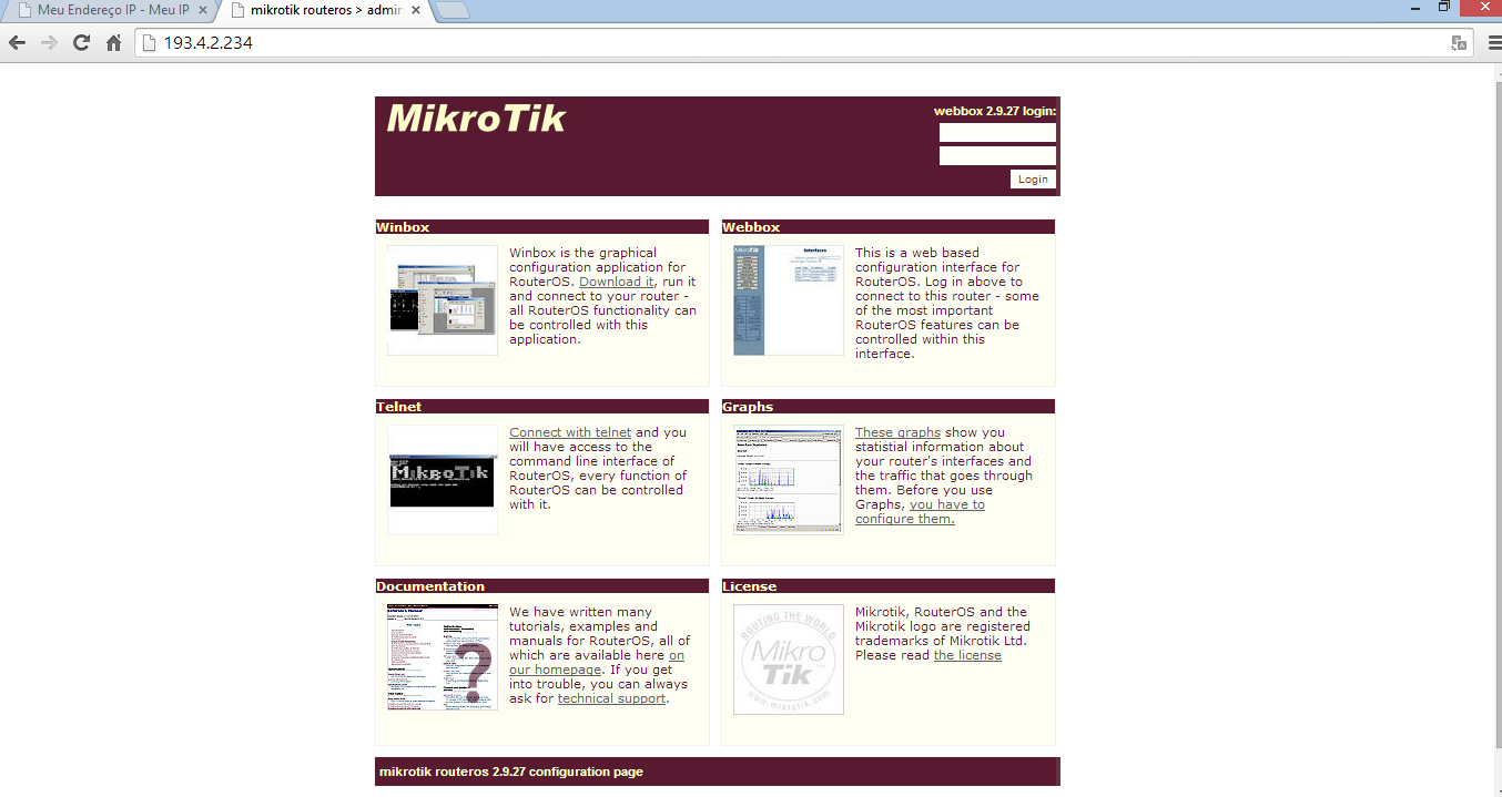 Assim.. sobre o fato de criar um server, tem que abrir portas digamos, um server de internet, tem que ser a porta 80, ok... fui la no roteador e em servidores virtuais eu abri a porta 80 de meu pc, depois criei um DDns do No-ip para usar no lugar do ip publico, mas quando uso o IP publico ou o nome de DDns, ele abre em uma pagina de login da Mikrotik, isso serve também para todos os serviços que quero usar, pra jogos e etc., e não adianta redirecionar a porta 80 para 8080 e etc, ele continua a mesma coisa, e quando uso o nome DDns ou IP publico em uma rede externa ele não abre, eu queria saber como funciona e como resolver esse problema, e se ao criar um server os computadores da rede externa, de outra rede ou provedor, ele conseguem se conectar a mim, vê a imagem anexada ai, como eu disse antes, usando o ip publico ou o ddns cai sempre nessa pagina por favor me ajudem nisso, isso parece mais um bloqueio seilá.  Então..  deste já fico muito agradecido.Anexo 54534