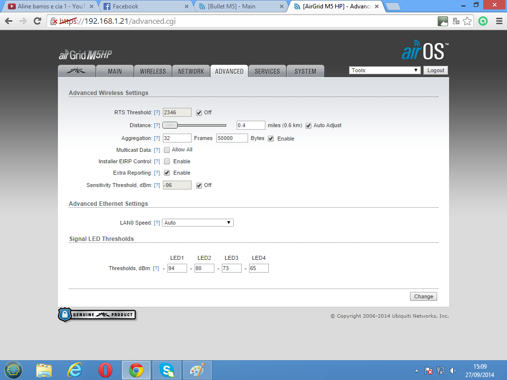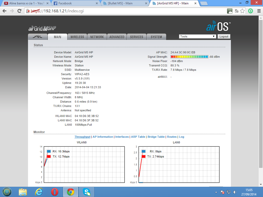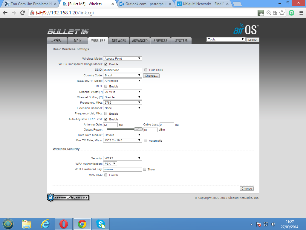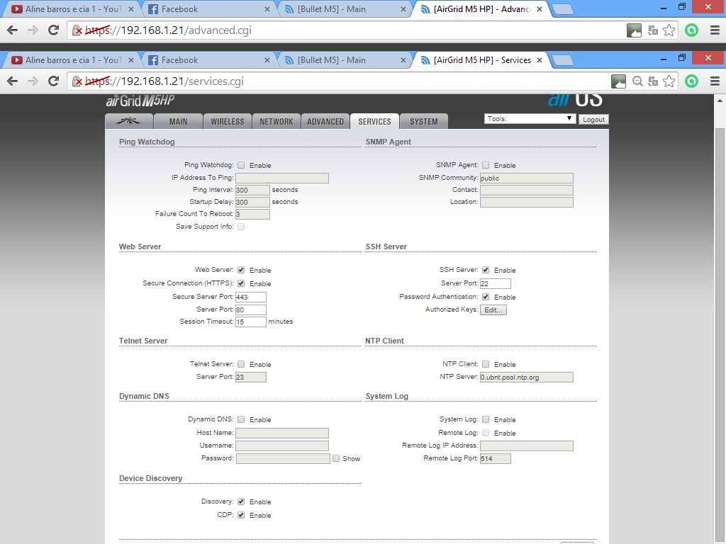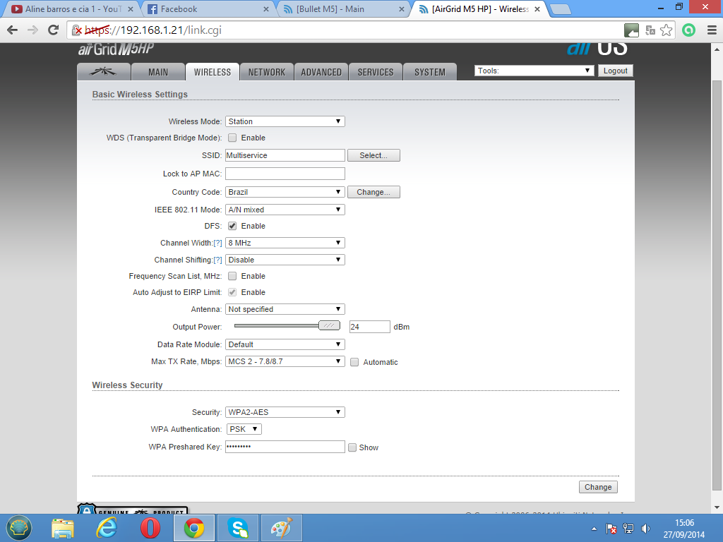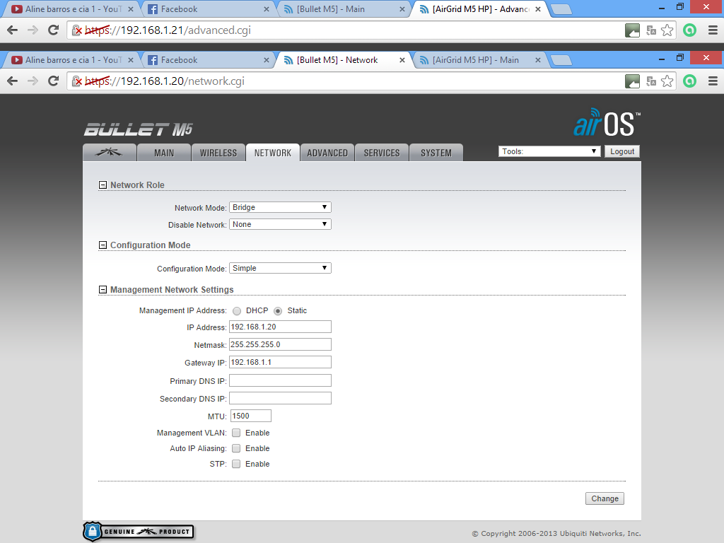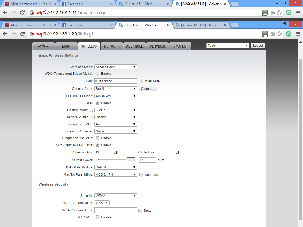Pessoal eu estou tendo um problema na COnfiguracao do Meu Bullet M5 eu fiz uma COnfiguracao Nele. e Instalei Uma Airgrid pra Receber o Sinal Vou Botar as Imagens da Configuracao Dele. Resulmo airgrid localiza o bullet mais nao consigo conectar a internet e nem ao bullet. o que eu faco vejam ai se minha configuracao ta correta